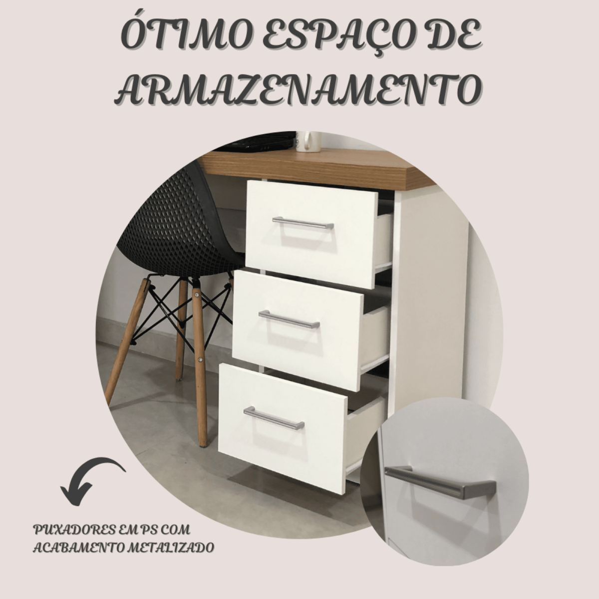 O amplo tampo garante muito conforto e comodidade, para você trabalhar ou estudar com muito espaço para seu computador, notebook, papéis, livros e outros materiais. O revestimento de alta qualidade proporciona resistência a impactos, atrito e umidade, certificando uma maior durabilidade ao móvel. O produto perfeito para aumentar o bem estar e a eficiência no trabalho, já que possui o tamanho ideal para maior conforto e produtividade!