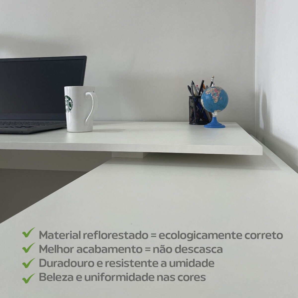 O espaçoso tampo garante muito conforto e comodidade, enquanto os 8 nichos são ideais para manter o local em ordem, já que proporcionam amplo espaço para facilitar a organização no seu dia a dia. Matéria prima ecologicamente correta e revestimento em BP de alta qualidade proporcionam resistência a impactos, atrito e umidade, certificando uma maior durabilidade ao móvel. O produto perfeito para aumentar o bem estar e a eficiência no trabalho, já que possui o tamanho ideal para maior conforto e produtividade!