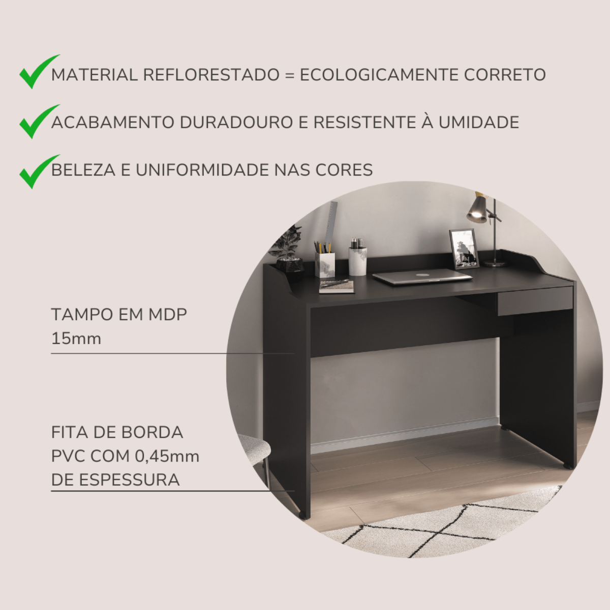 O revestimento deste produto é todo em BP, o que garante facilidade na hora de limpar e muito mais resistência a desgastes e a umidade! Além disso, possui uma gaveta que pode ser montada para o lado direito ou esquerdo, de acordo com o que mais se adapta a você! Com tantas vantagens, a Escrivaninha Slim é o produto que falta para seu trabalho ou estudo ficar ainda melhor!