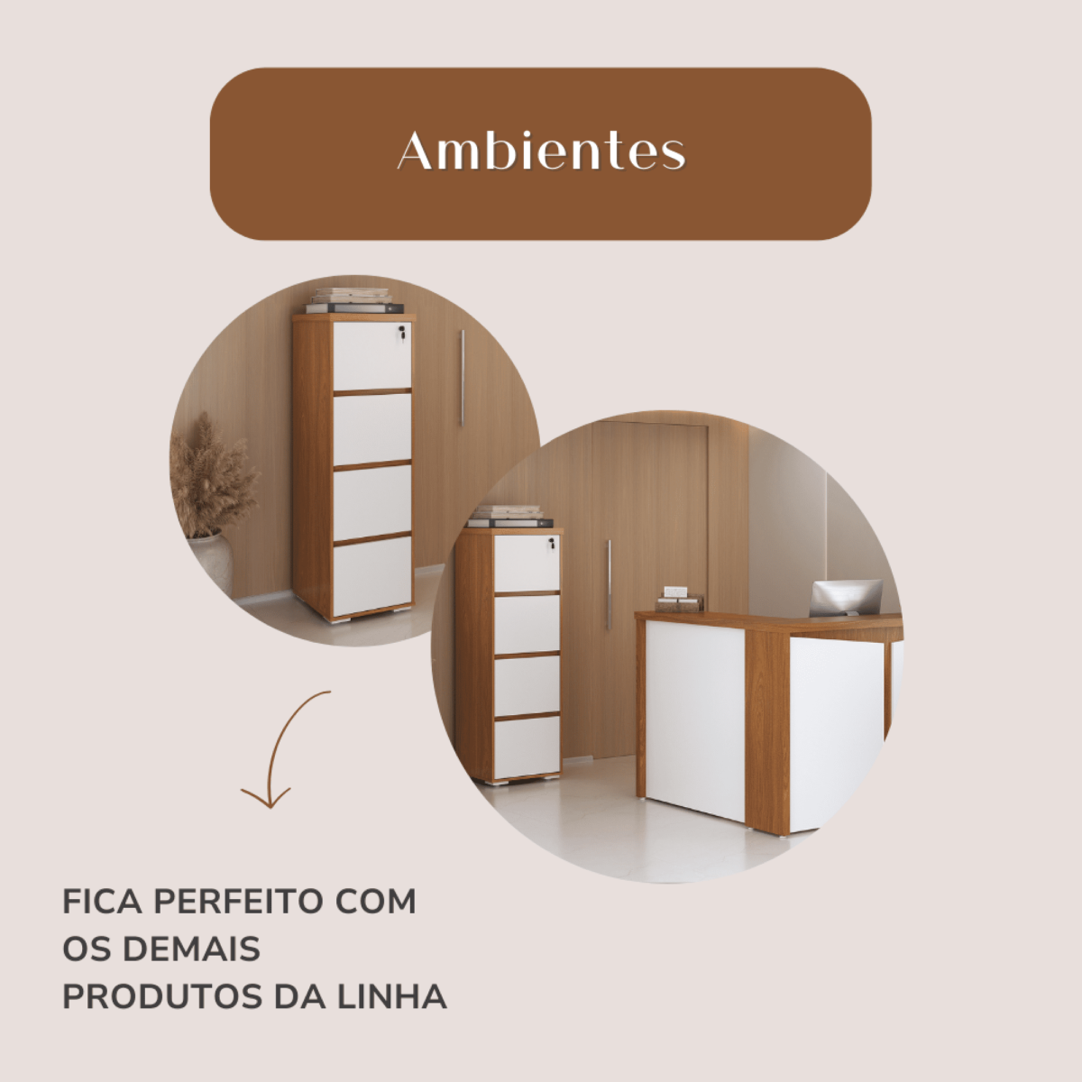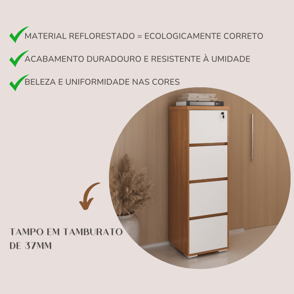 Um design único e contemporâneo garante elegância ao produto, que possui 4 amplas gavetas para acomodar arquivos de forma fácil e prática. Materiais de alta qualidade e trilhos telecópicos garantem que as gavetas suportem grande peso e abram e fechem de forma delicada e uniforme. Conta com chave para que você possa guardar documentos, papéis e objetos pessoais com garantia de segurança e conveniência. Unindo praticidade e elegância, este produto é o que falta para seu escritório ou sua casa!