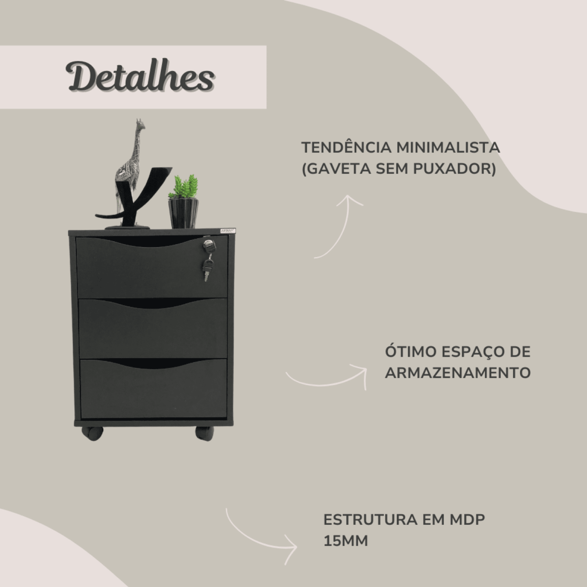 As 3 amplas gavetas são ideais para separar seus materiais, e assim sempre manter a organização no ambiente! Seu design versátil e cores neutras se encaixam com qualquer estilo, seja no Home Office, Escritório mais formal, quarto ou onde você precisar de mais um espacinho para suas coisas!!
